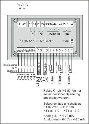 - Die 6 Ausgangsrelais können entweder alle mit 24V DC oder alle mit 230V AC betrieben werden.