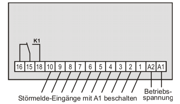 Eingangssignale werden LOW-ACTIV verarbeitet, dass heißt: Im Betriebszustand muss an den Störeingängen Spannung anliegen. Ein Fehler wird dann angezeigt, wenn die Spannung abfällt.