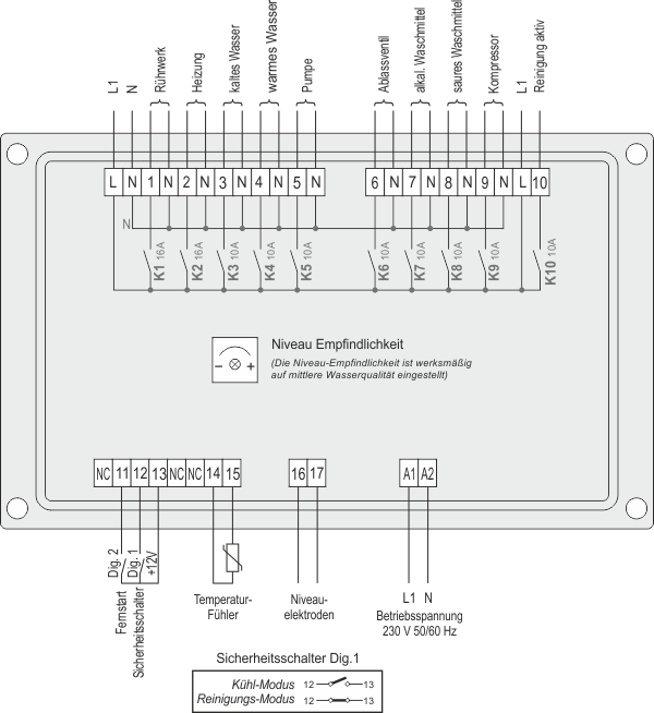 Die Universal-Kühltanksteuerung ist auch fertig vormontiert in einem stabilen Schaltkasten (IP65) für die Wandmontage lieferbar. Erforderliche Schaltschütze für Spülpumpe und Heizung sind hier bereits integriert und fertig verdrahtet.